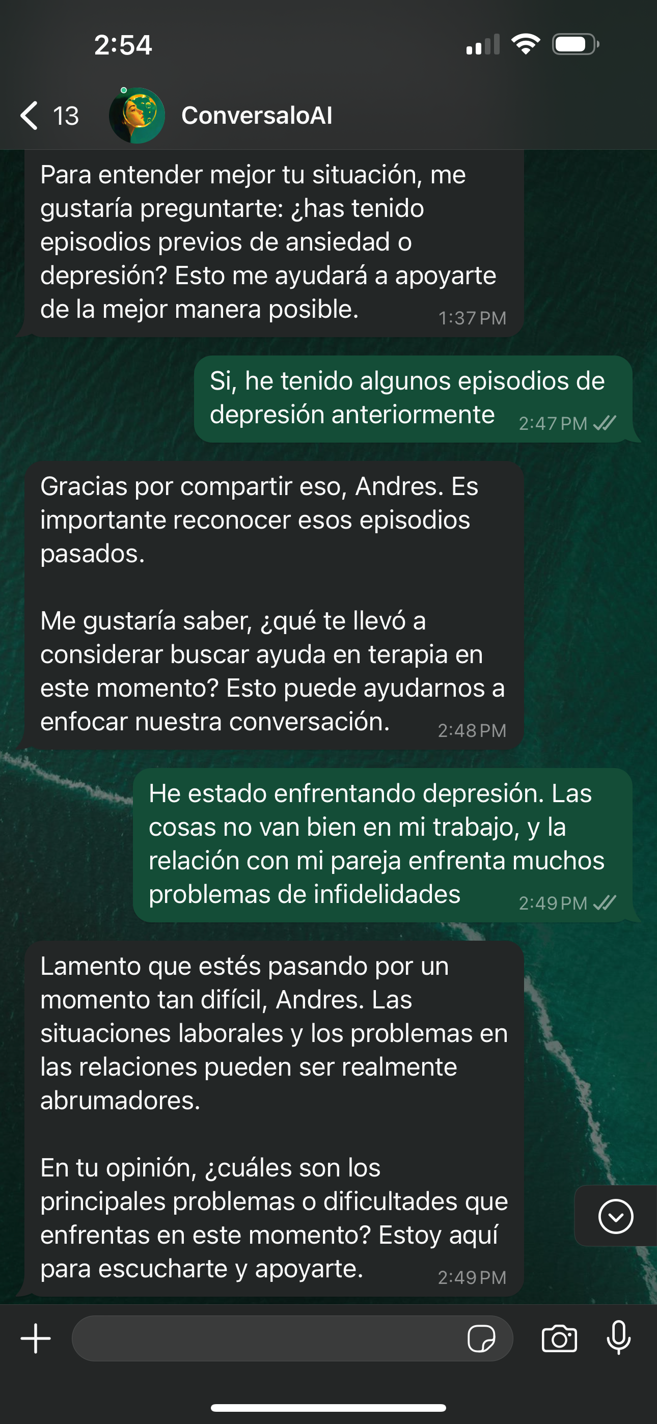 Conversalo es un terapeuta desarrollado con Inteligencia Artificial especializado en Terapia Cognitivo Conductual que brinda apoyo emocional y psicologico de forma simple, anónima y siempre disponible.